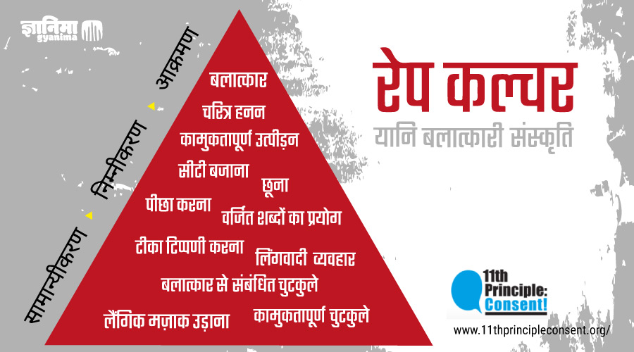 विदेश में निर्मित यह त्रिकोण बलात्कार को रेप कल्चर का अन्तिम पायदान मानता है पर भारत में इस त्रिकोण का सबसे ऊपरी हिस्सा पीड़िता के खून से सन जाता है। क्योंकि हमारी न्याय व्यवस्था दुरुस्त नहीं है, हमलावर साक्ष को मिटा कर स्वयं को बचाने के लिए पीड़िता की हत्या कर देता है।