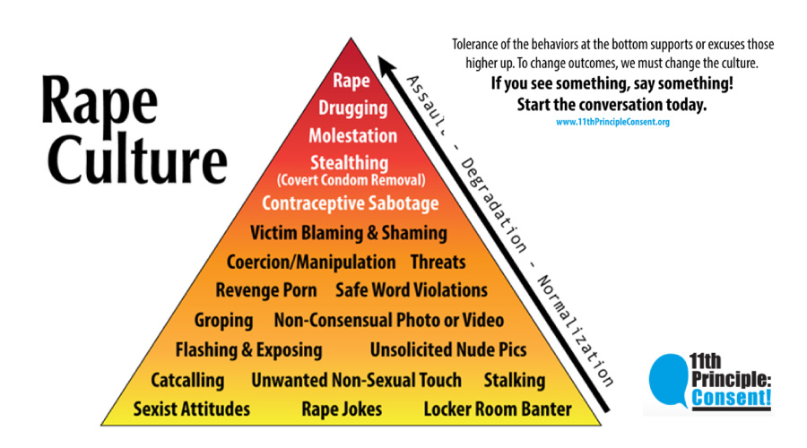 रेप कल्चर, यानि बलात्कारी संस्कृति को समझने के लिए नीचे दर्शाये गए त्रिकोण को समझना होगा। यह त्रिकोण बलात्कारी मानसिकता के विकास तो चित्रित करता है। सरलीकरण के लिए मूल चित्र से कुछ चीजें हटा दी गई हैं।